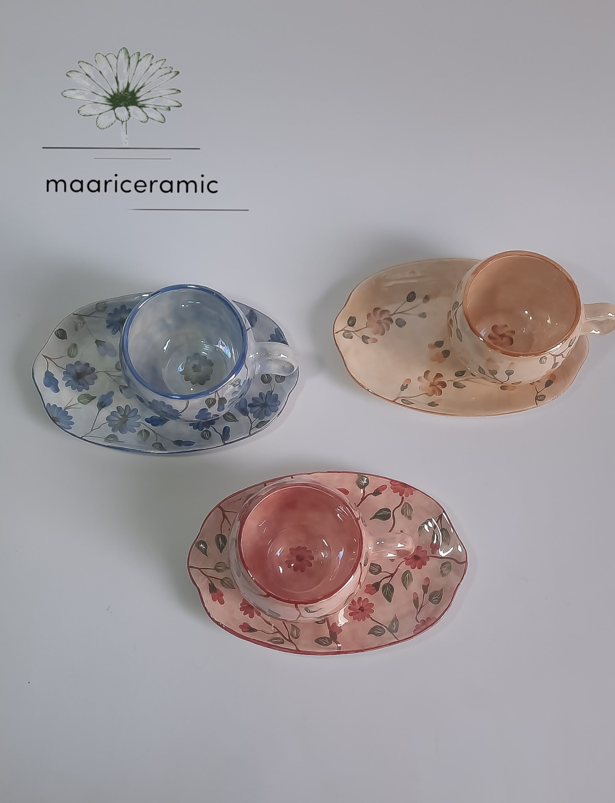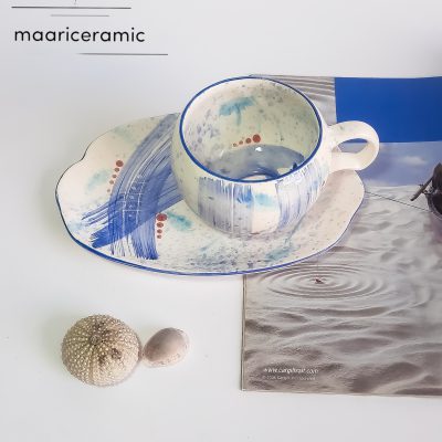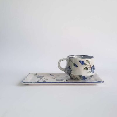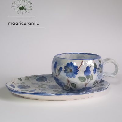ست فنجان سرامیکی شامل زیر فنجانی و فنجان سرامیکی به رنگ لاجوردی و لعاب صدفی، یک ست پذیرایی شیک و